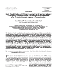 rehabilitation group:group T). The subjects stood on the device and maintained balance. Then, low-frequency stimulation waves were applied to 2 points each in the anterior and posterior region of the injured thigh 3 times a week for 3 months. Measurement of muscle strength was performed 4 times (before the start, and then once a month). Muscle mass was evaluated in CT images of the extensor and flexor muscles of 10 knees (10 subjects) in each group. The injured legs of group N showed significant improvement after one month compared to group T. The cross-sectional area of the extensor muscles of the injured legs tended to a show a greater increase at 3 months in group N. This rehabilitation method makes it possible to contract fast-twitch muscles, which may be a useful for improving extensor muscle strength after ACL reconstruction.