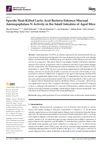 | Citation | Tsuruta, T.; Wakisaka, M.; Watanabe, T.; Nishijima, A.; Ikeda, A.; Teraoka, M.; Wang, T.; Chen, K.; Nishino, N. Specific Heat-Killed Lactic Acid Bacteria Enhance Mucosal Aminopeptidase N Activity in the Small Intestine of Aged Mice. Int. J. Mol. Sci. 2025, 26, 5742. https://doi.org/10.3390/ijms26125742