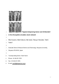 | Abstract | Animals possess a circadian central clock in the brain, where circadian behavioural rhythms are generated. In the fruit fly (Drosophila melanogaster), the central clock comprises a network of approximately 150 clock neurons, which is important for the maintenance of a coherent and robust rhythm. Several neuropeptides involved in the network have been identified, including Pigment-dispersing factor (PDF) and CCHamide1 (CCHa1) neuropeptides. PDF signals bidirectionally to CCHa1-positive clock neurons; thus, the clock neuron groups expressing PDF and CCHa1 interact reciprocally. However, the role of these interactions in molecular and behavioural rhythms remains elusive. In this study, we generated Pdf (01) and CCHa1(SK8) double mutants and examined their locomotor activity-related rhythms. The single mutants of Pdf (01) or CCHa1(SK8) displayed free-running rhythms under constant dark conditions, whereas approximately 98% of the double mutants were arrhythmic. In light-dark conditions, the evening activity of the double mutants was phase-advanced compared with that of the single mutants. In contrast, both the single and double mutants had diminished morning activity. These results suggest that the effects of the double mutation varied in behavioural parameters. The double and triple mutants of per (01), Pdf (01), and CCHa1(SK8) further revealed that PDF signalling plays a role in the suppression of activity during the daytime under a clock-less background. Our results provide insights into the interactions between PDF and CCHa1 signalling and their roles in activity rhythms.