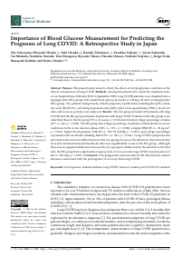 | Citation | Yokoyama, S.; Honda, H.; Otsuka, Y.; Tokumasu, K.; Nakano, Y.; Sakurada, Y.; Matsuda, Y.; Sunada, N.; Hasegawa, T.; Takase, R.; et al. Importance of Blood Glucose Measurement for Predicting the Prognosis of Long COVID: A Retrospective Study in Japan. J. Clin. Med. 2024, 13, 4099. https://doi.org/10.3390/jcm13144099