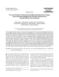 | Abstract | We investigated the effectiveness of a treat-and-extend regimen (TAE) of intravitreal ranibizumab injections for macular edema (ME) due to branch retinal vein occlusion (BRVO). We retrospectively examined 2-year results of 32 eyes of 32 patients who underwent TAE to treat ME due to BRVO. The patients whose treatment interval extended to ≥ 12 weeks were switched to a pro re nata regimen (PRN). For the patients whose treatment interval was <12 weeks, TAE was continued. At 2 years, 10 eyes had required no additional injections after the initial treatment period [recurrence(−) group], whereas the other 22 eyes required additional treatment [recurrence(+) group]. Among the recurrence(+) patients, 11 eyes (34.4% of total) were eventually switched from TAE to PRN; the other 11 eyes (34.4%) continued TAE for 2 years. Visual acuity and central retinal thickness were significantly improved in both the recurrence(+) and (−) groups, and there was no significant betweengroup difference in visual acuity at 2 years. Univariate analyses revealed significant differences in visual acuity (p=0.004), age (p=0.014), and vessel occlusion site (p=0.018) between these groups. Our results suggest that TAE may be effective for BRVO patients with lower visual acuity, older age, and occlusion of a major vein.