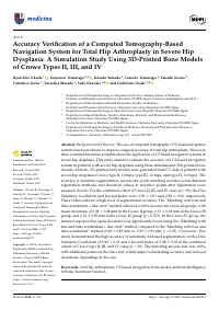 | Citation | Okuda, R.; Tetsunaga, T.; Yamada, K.; Tetsunaga, T.; Koura, T.; Inoue, T.; Masada, Y.; Okazaki, Y.; Ozaki, T. Accuracy Verification of a Computed Tomography-Based Navigation System for Total Hip Arthroplasty in Severe Hip Dysplasia: A Simulation Study Using 3D-Printed Bone Models of Crowe Types II, III, and IV. Medicina 2025, 61, 973. https://doi.org/10.3390/medicina61060973