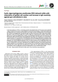 | Abstract | Cyclic nigerosylnigerose (CNN) is a cyclic oligosaccharide. Oral administration of CNN promotes immunoglobulin A (IgA) secretion in the gut. IgA is a major antibody secreted into the gut and plays a crucial role in suppressing gut inflammation due to commensal gut microbiota. To investigate the effect of administration of CNN to promote IgA secretion on gut inflammation, experimental colitis was induced with dextran sulfate sodium (DSS) in Balb/c mice after 6 weeks of CNN pre-feeding. The severity of colitis was evaluated based on a disease activity index (DAI), the gene expression of inflammatory cytokines, and a histological examination. The CNN-treated mice with DSS-induced colitis (CNN-DSS group) showed significantly lower DAI scores and mRNA levels of interleukin-1 compared with the CNN-untreated mice with DSS-induced colitis (DSS group). Histological examination of the colon revealed that the pathological score was significantly lower in the CNN-DSS group compared with the DSS group due to the reduced infiltration of immune cells. The number of goblet cells was significantly higher in the CNN-DSS group compared with the DSS group. The IgA concentration and the ratio of microbiota coated with IgA were evaluated in the cecal content. Although there was no difference in the IgA concentration among groups, a higher proportion of cecal microbiota were coated with IgA in the CNN-DSS group compared with that in the DSS group. These results suggest that CNN might preserve goblet cells in the colon and promote IgA coating of gut microbiota, which synergistically ameliorate gut inflammation in mice with DSS-induced colitis.