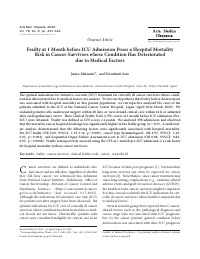 | Abstract | The optimal indications for intensive care unit (ICU) treatment for critically ill cancer survivors whose condition has deteriorated due to medical factors are unclear. To test our hypothesis that frailty before deterioration was associated with hospital mortality in this patient population, we retrospective analyzed the cases of the patients admitted to the ICU at the National Cancer Center Hospital, Japan (April 2014-March 2022). We excluded patients who underwent surgery within 28 days or were denied critical care within 24 h or admitted after cardiopulmonary arrest. Their Clinical Frailty Scale (CFS) scores at 1 month before ICU admission (Pre-ICU) were obtained. Frailty was defined as CFS scores ≥4 points. We analyzed 298 admissions and observed that the mortality rate at hospital discharge was significantly higher in the frailty group (n=119). A multivariate analysis demonstrated that the following factors were significantly associated with hospital mortality: Pre-ICU frailty (OR 2.00, 95%CI: 1.19-3.36, p=0.009), cancer type (hematological: OR 2.93, 95%CI: 1.42-6.05, p=0.004), and Sequential Organ Failure Assessment score at ICU admission (OR 0.88, 95%CI: 0.82-0.95, p=0.0008). Frailty retrospectively assessed using the CFS at 1 month pre-ICU admission is a risk factor for hospital mortality in these cancer survivors.