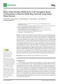 Citation | Ohkawa, S.; Ueda, K.; Miyoshi, T.; Yamazaki, T.; Yamamoto, R.; Funabiki, N. Relay Node Selection Methods for UAV Navigation Route Constructions in Wireless Multi-Hop Network Using Smart Meter Devices. Information 2025, 16, 22. https://doi.org/10.3390/info16010022