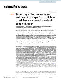 Abstract | To investigate the dynamics of body mass index (BMI) and height changes in childhood leading to obesity in adolescents. BMI Z-scores were calculated using the LMS (lambda-mu-sigma) method based on yearly height and weight information (age 1.5-15 years) from a nationwide Japanese birth cohort that started in 2001 (n = 26,711). We delineated the trajectories of BMI and height changes leading to obesity at age 15 years using mixed effect models. Children who became obese at the age of 15 years kept relatively high BMI z-scores through childhood for both genders, and had an increasing trend over time as opposed to the normal weight group, with an increasing slope during puberty. Early adiposity rebound was associated with overweight or obesity at the age of 15 years. Age at peak height velocity (APHV) occurred earlier in the obese/overweight group at age 15 years than in the normal weight group, and occurred later in the underweight group. Obese adolescents experienced early adiposity rebound timing and maintained a serial BMI z-score increase throughout childhood, with a greater slope at puberty. An earlier peak in height gain during puberty may have contributed to the observed patterns of BMI change.