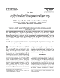 | Abstract | Nasal chondromesenchymal hamartoma (NCMH), a rare, benign, nasal cavity tumor, typically occurs in children. Differential diagnosis is difficult because NCMH often presents with non-specific findings, including cystic components and invasion of the surrounding area on T2-weighted magnetic resonance images. Here, we present a rare adult case of NCMH, with no clear hyperintensity on diffusion-weighted images (DWI), and bone remodeling on the tumor margins on computed tomography. To the best of our knowledge, this is the first report of DWI on NCMH, and these findings, which suggest benign disease, may be useful in diagnosing NCMH.