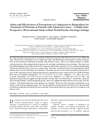 | Abstract | The clinical benefit of perospirone for treatment of delirium in patients with advanced cancer is not sufficiently clear. The objective of this study was to compare the safety and effectiveness of perospirone to those of risperidone for the treatment of delirium in patients with advanced cancer. This is a secondary analysis of a multicenter prospective observational study in nine psycho-oncology consultation services in Japan. The study used the Delirium Rating Scale (DRS) Revised-98 to measure effectiveness and the CTCAE (Common Terminology Criteria for Adverse Events) version 4 to assess safety. Data from 16 patients who received perospirone and 53 patients who received risperidone were analyzed. The mean age was 70 years in the perospirone group and 73 years in the risperidone group. Both groups showed a significant decrease in the total score of DRS-R-98 after three days of treatment (perospirone: 11.7 (7.9-15.4) to 7.0 (3.3-10.7), difference −4.7, effect size=0.72, p=0.003; risperidone: 15.5 (13.6-17.4) to 12.2 (10.1-14.2), difference −3.3, effect size=0.55, p=0.00). The risperidone group showed significant improvements in sleep-wake cycle disturbance, orientation, attention, and visuospatial ability. In the perospirone group, there was a significant improvement of sleep-wake cycle disturbance. The median daily dose of perospirone was 4 mg/day. There were fewer episodes of somnolence as an adverse event in the perospirone group. Low-dose perospirone was thus found to be effective for the treatment of delirium in patients with advanced cancer and may be associated with fewer episodes of over-sedation as an adverse event.