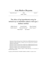 | Abstract | We examined the effect of leg hyperthermia on oxidative stress in bedridden subjects with type 2 diabetes mellitus using 15-min sessions of far infrared rays over a two-week period. Four subjects (male 1, female 3) incapacitated by a stroke were recruited for this study. All patients were admitted to Takahashi Central Hospital and ate the same hospital meals. Fasting plasma glucose, HbA1c, tumor necrosis factor (TNF)alpha, free fatty acid, leptin, adiponectin and plasma 8-epi-prostaglandin F2alpha (8-epi-PGF2alpha) levels as a marker of oxidative stress were measured on admission, just before and 2 weeks after local heating of the leg. Results showed that plasma total 8-epi-PGF2alpha levels were decreased significantly while TNFalpha levels were increased significantly. On the other hand, glucose, HbA1c, free fatty acid, leptin and adiponectin levels were not changed during the study period. These results suggest that repeated leg hyperthermia may protect against oxidative stress. |
