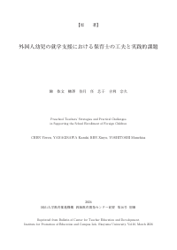 本研究は,外国人幼児が就学期に直面する困難に対応するため,保育士が行っている具体的な保育実践における支援の工夫と課題を明らかにすることを目的とした。外国人幼児の支援経験を有する保育士2 名に半構造化インタビューを行い,SCAT を用いた質的分析により,幼児および保護者への支援内容を整理した。その結果,言語面では視覚的支援ややさしい日本語を活用し,文化面では家庭文化と日本の園文化の調整が行われていた。発達支援においては,非認知的スキルの育成や医療機関との連携の必要性が指摘された。保護者支援では,参加型の関わりや丁寧な説明が実践されていたが,制度情報の提供や行政との連携には課題が残された。これらの結果を踏まえ,今後は保育士の個別的努力に依存しないためにも,多文化背景をもつ家庭への支援を制度的に支える地域連携体制の整備や,情報提供の標準化,日本語教育資源との接続を図る実践的仕組みの構築が求められる。