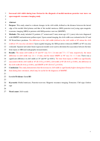 This study aimed to evaluate changes in the cleft width, defined as the distance between the lateral edge of the medial tibial plateau and that of the medial meniscus (MM) posterior root, using open magnetic resonance imaging (MRI) in patients with MM posterior root tear (MMPRT). Methods This study included 25 patients (20 women and 5 men; mean age: 65.2 years) who were diagnosed with MMPRT and underwent pullout repair. Upon coronal imaging, the cleft width was evaluated at the 10° and 90° flexed knee positions. The difference in the cleft width (defined as the cleft width at 90° minus the cleft width at 10°) was also calculated. Upon sagittal imaging, the MM posterior extrusion (MMPE) at 90° was also evaluated. Separate univariate linear regression models were used to determine the association between the time from injury to MRI and radiographic measurements. Results The mean cleft width at 10° and 90° was 4.9 ± 2.6 mm and 7.4 ± 3.7 mm, respectively; the mean difference in cleft width was 2.5 ± 1.5 mm, and the mean MMPE at 90° was 3.7 ± 1.3 mm. There was a significant difference in cleft width at 10° and 90° (p < 0.001). The time from injury to MRI was significantly associated with the cleft width at 10° (R = 0.42; p = 0.023), cleft width at 90° (R = 0.59; p = 0.002), the difference in the cleft width (R = 0.62; p = 0.008), and MMPE at 90° (R = 0.53; p = 0.008). Conclusion This study demonstrates that the cleft width is significantly larger during knee flexion than during knee extension. Increased cleft width during knee flexion (“graben” sign) may help diagnose MMPRT, especially in cases where the cleft sign is unclear during knee extension. |