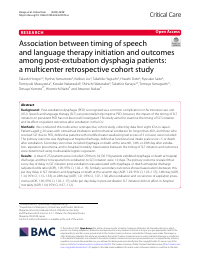 | 抄録 | Background Post-extubation dysphagia (PED) is recognized as a common complication in the intensive care unit (ICU). Speech and language therapy (SLT) can potentially help improve PED; however, the impact of the timing of SLT initiation on persistent PED has not been well investigated. This study aimed to examine the timing of SLT initiation and its effect on patient outcomes after extubation in the ICU. Methods We conducted this multicenter, retrospective, cohort study, collecting data from eight ICUs in Japan. Patients aged >= 20 years with orotracheal intubation and mechanical ventilation for longer than 48 h, and those who received SLT due to PED, defined as patients with modified water swallowing test scores of 3 or lower, were included. The primary outcome was dysphagia at hospital discharge, defined as functional oral intake scale score < 5 or death after extubation. Secondary outcomes included dysphagia or death at the seventh, 14th, or 28th day after extubation, aspiration pneumonia, and in-hospital mortality. Associations between the timing of SLT initiation and outcomes were determined using multivariable logistic regression. Results A total of 272 patients were included. Of them, 82 (30.1%) patients exhibited dysphagia or death at hospital discharge, and their time spans from extubation to SLT initiation were 1.0 days. The primary outcome revealed that every day of delay in SLT initiation post-extubation was associated with dysphagia or death at hospital discharge (adjusted odds ratio (AOR), 1.09; 95% CI, 1.02-1.18). Similarly, secondary outcomes showed associations between this per day delay in SLT initiation and dysphagia or death at the seventh day (AOR, 1.28; 95% CI, 1.05-1.55), 14th day (AOR, 1.34; 95% CI, 1.13-1.58), or 28th day (AOR, 1.21; 95% CI, 1.07-1.36) after extubation and occurrence of aspiration pneumonia (AOR, 1.09; 95% CI, 1.02-1.17), while per day delay in post-extubation SLT initiation did not affect in-hospital mortality (AOR, 1.04; 95% CI, 0.97-1.12). Conclusions Delayed initiation of SLT in PED patients was associated with persistent dysphagia or death. Early initiation of SLT may prevent this complication post-extubation. A randomized controlled study is needed to validate these results.
