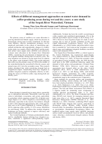 | 抄録 | The primary cause of conflicts over water allocation is growing demand and limited supply, which has become an increasingly serious issue in many watersheds. To alleviate water disputes, effective management strategies can be employed, particularly in the context of intensifying agricultural production and unpredictable changes in weather. In this study, two models, SWAT and WEAP, and the modified surface water supply index (MSWSI) were utilized to evaluate water allocation in the Srepok River Watershed (SRW), considering the prioritization of demand and various irrigation methods, during both wet and dry years. The crop irrigation was chosen to be the main focus in relation to the unmet water demand (UWD). The results indicated that coffee was the primary cause of UWD in the middle of the watershed during the second half of the dry season, and annual crops (AC) were the secondary cause. This research further elucidated that while prioritizing demand had an insignificant impact, transitioning from hose irrigation to sprinkler irrigation could be remarkably effective in mitigating the issues of UWD in coffee crops during both wet and dry years.