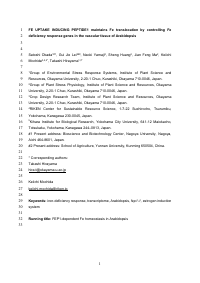 | 備考 | This is the peer reviewed version of the following article: [Okada, S., Lei, G.J., Yamaji, N., Huang, S., Ma, J.F., Mochida, K., et al. (2022) FE UPTAKE-INDUCING PEPTIDE1 maintains Fe translocation by controlling Fe deficiency response genes in the vascular tissue of Arabidopsis. Plant, Cell & Environment, 45, 3322–3337. https://doi.org/10.1111/pce.14424], which has been published in final form at [https://doi.org/10.1111/pce.14424]. This article may be used for non-commercial purposes in accordance with Wiley Terms and Conditions for Use of Self-Archived Versions. This article may not be enhanced, enriched or otherwise transformed into a derivative work, without express permission from Wiley or by statutory rights under applicable legislation. Copyright notices must not be removed, obscured or modified. The article must be linked to Wiley’s version of record on Wiley Online Library and any embedding, framing or otherwise making available the article or pages there of by third parties from platforms, services and websites other than Wiley Online Library must be prohibited.