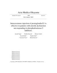 抄録 | We report on 64 patients who did not achieve erections adequate for satisfactory sexual intercourse from among a total of 243 patients who were prescribed PDE5 inhibitors for erectile dysfunction (ED). Intracavernous injection (ICI) of PGE was performed in this non-responder group. An ICI of 20 or 40 mcg of PGE1 in 1 ml saline was performed and the responses evaluated. Forty-nine out of 64 (77 percent ) cases responded to 20 mcg of PGE1. Forty mcg of PGE was injected into the 15 non-responding cases, and 9 patients responded favorably. The overall effective rate was 58/64 (91 percent ). No major adverse effects were observed. |