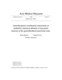 | 抄録 | Antroduodenal contractions were studied in rat preparations. Augmented duodenal contractions occurred spontaneously in coordination with antral contractions in normal and saline-pretreated preparations. The coordination did not occur when muscle layers and the myenteric plexus were transversely cut at the duodenum just anal to the gastroduodenal junction. In silent preparations, the coordinated contractions were produced by neostigmine or domperidone. When the antroduodenal junctional zone was pretreated with benzalkonium chloride, the augmented duodenal contractions did not occur spontaneously, and even after administration of neostigmine and domperidone although antral contractions occurred spontaneously. In these preparations, there were notably few myenteric neurons in the junctional zone, but the neurons were distributed normally in the areas where motility was recorded. The results suggest that myenteric neurons mediate antroduodenal coordinated contractions and that the coordination is modified by myenteric cholinergic excitatory and dopaminergic inhibitory pathways. |