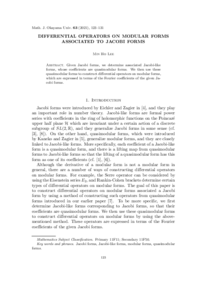 | 抄録 | Given Jacobi forms, we determine associated Jacobi-like forms, whose coefficients are quasimodular forms. We then use these quasimodular forms to construct differential operators on modular forms, which are expressed in terms of the Fourier coefficients of the given Jacobi forms.